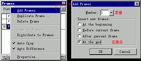 首先,单击“Frames”面板右上角如图2按钮,选择“Add Frames”,在弹出的对话框中选择“Number”为1和“At the end”,单击“ok”按钮。