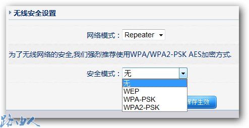 四、点击无线安全管理,在模式中选择Repeater,在安全模式中,选择中继加密模式,输入密码,保存。